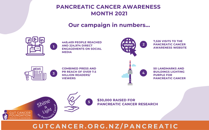 Every year over 730 Kiwis are diagnosed with pancreatic cancer. Only 12% of those diagnosed will survive beyond 5 years. The Shine A Light campaign aims to tackle these numbers head-on by raising awareness of the symptoms and risk factors to help with earlier diagnosis and prevention. We are extremely grateful to everyone who made the campaign a success and particularly humbled by the bravery and dedication of those telling their stories throughout.
