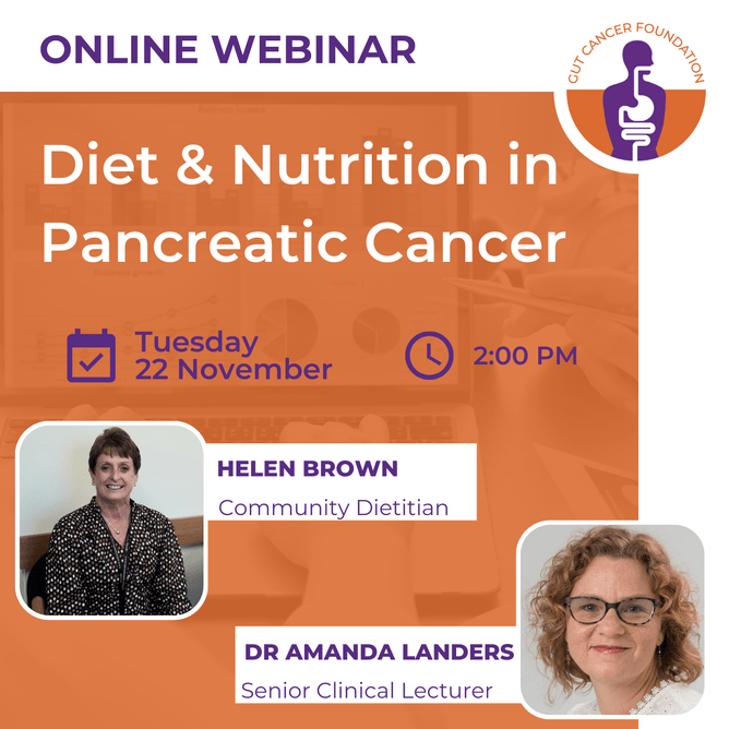 Join us and our guest speakers, Dr Amanda Landers and Helen Brown, for this free online webinar where we will discuss diet and nutrition in relation to pancreatic cancer. We will explore how a pancreatic cancer diagnosis impacts on diet and nutrition, discuss what to consider during treatment and following surgery, the importance of Pancreatic Enzyme Replacement Therapy (PERT) and the role of diet and nutrition support during palliative care.