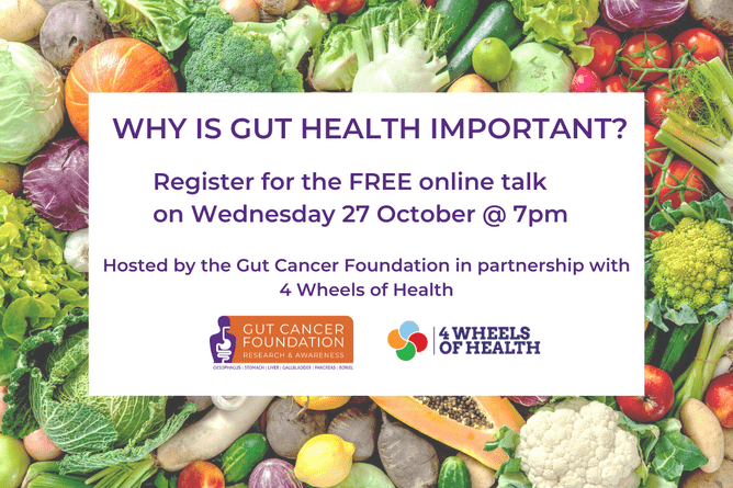 Join the Gut Cancer Foundation for a FREE online talk with our partners from 4 Wheels of Health, nutritionist Sean Robertson and chef Simon Gault on Wednesday 27th October at 7pm to get the answer to these questions and more.
