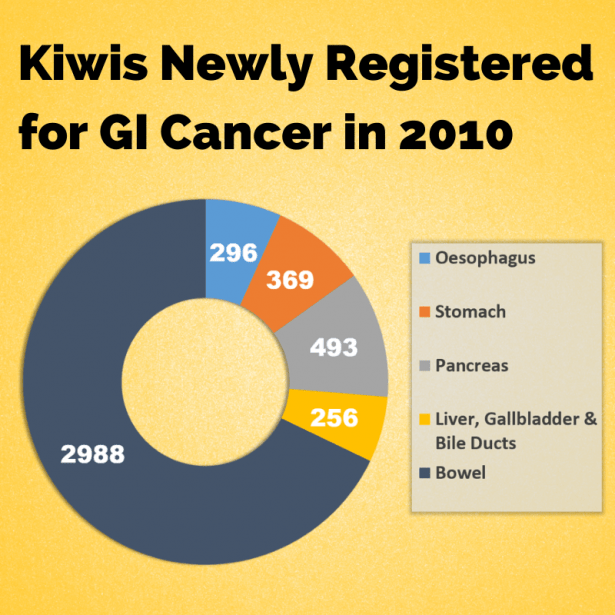 Here's the most recent data from the Ministry of Health on how many people were registered with GI cancers in 2010 alone. Collectively, this makes GI cancer the most common form of cancer in New Zealand.